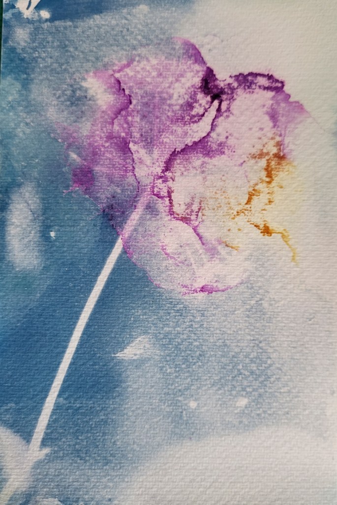 First time round, I felt that the consistency of the gelatine was too thick, so after a few more YouTube searches, I diluted it further. I’m still not sure I have the ratio of gelatine to cyanotype chemicals correct, if anything, I may have diluted the gelatine too far this time, as the solution did not adhere to the paper was well as I’d hoped. Again, this was exposed whilst the paper was still wet and again, whilst not what I had expected, it does have potential and I do quite like the painterly effect.