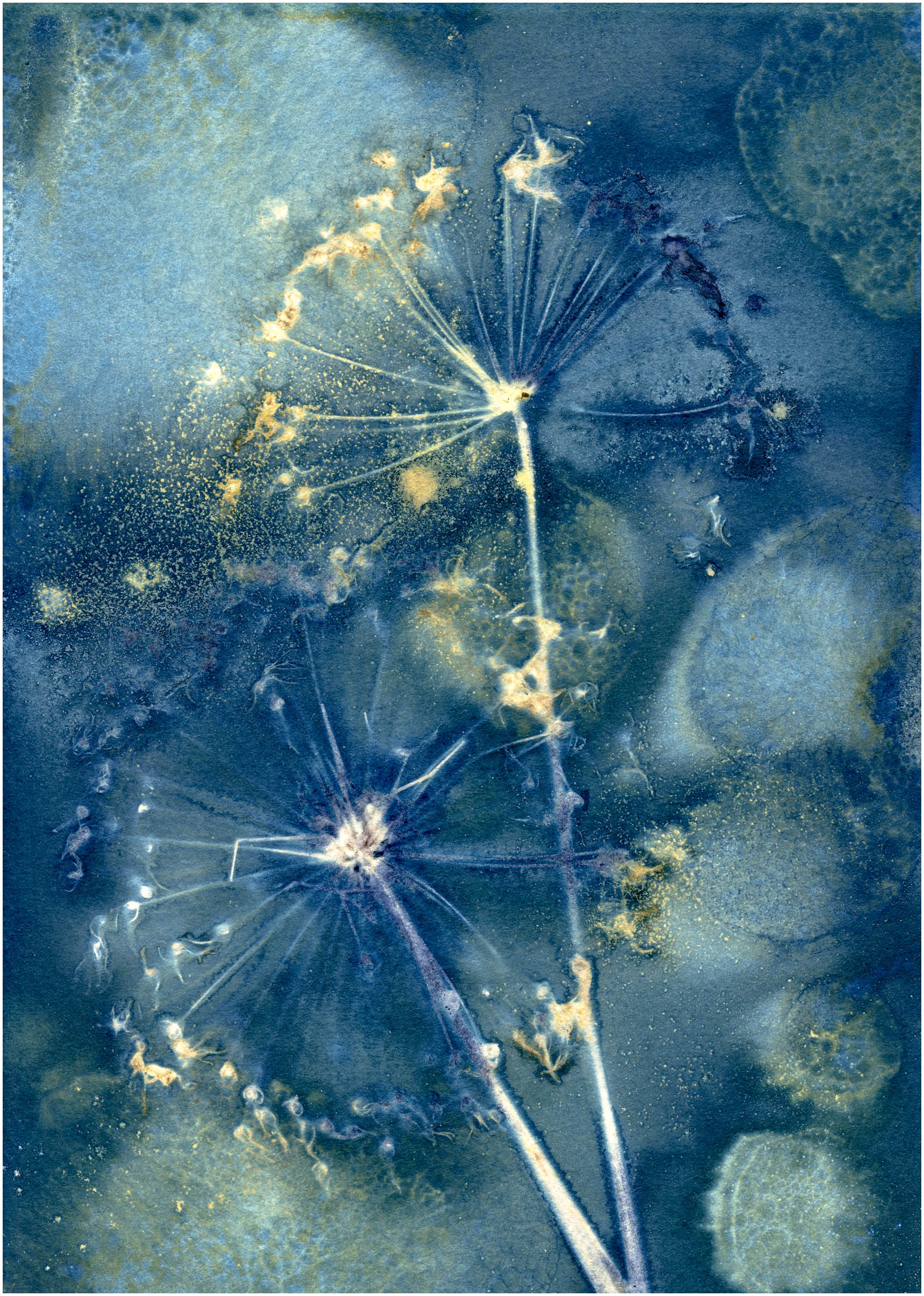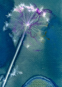 In the second print in my last post, which was on watercolour paper, whilst I quite liked the painterly effect, the whole thing was under exposed, either that or the PVA size, which I had added to allow me to manipulate the ink, had stopped the cyanotype chemicals from being absorbed into the paper. Either way, I needed to work out what was happening. So, I coated the paper and exposed it again, carefully placing the same seedhead onto the wet paper.